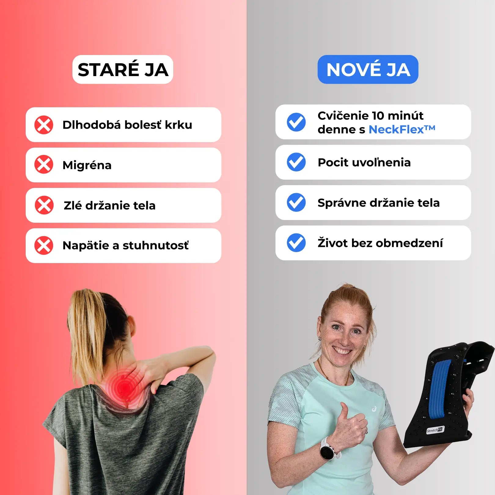 Naťahovač krku NeckFlex vám ponúka možnosť bojovať proti takýmto problémom alebo im predchádzať a to pravidelným naťahovaním a uvoľnovaním krčných svalov.